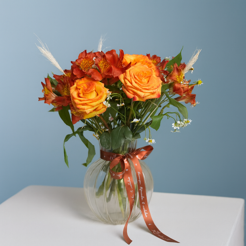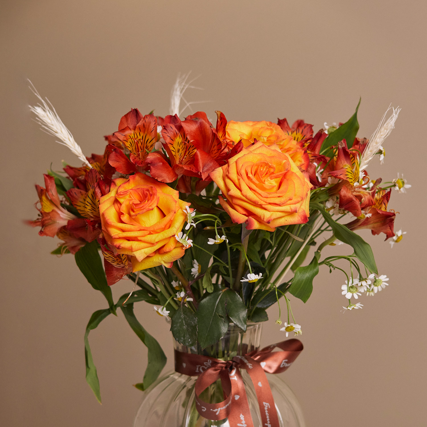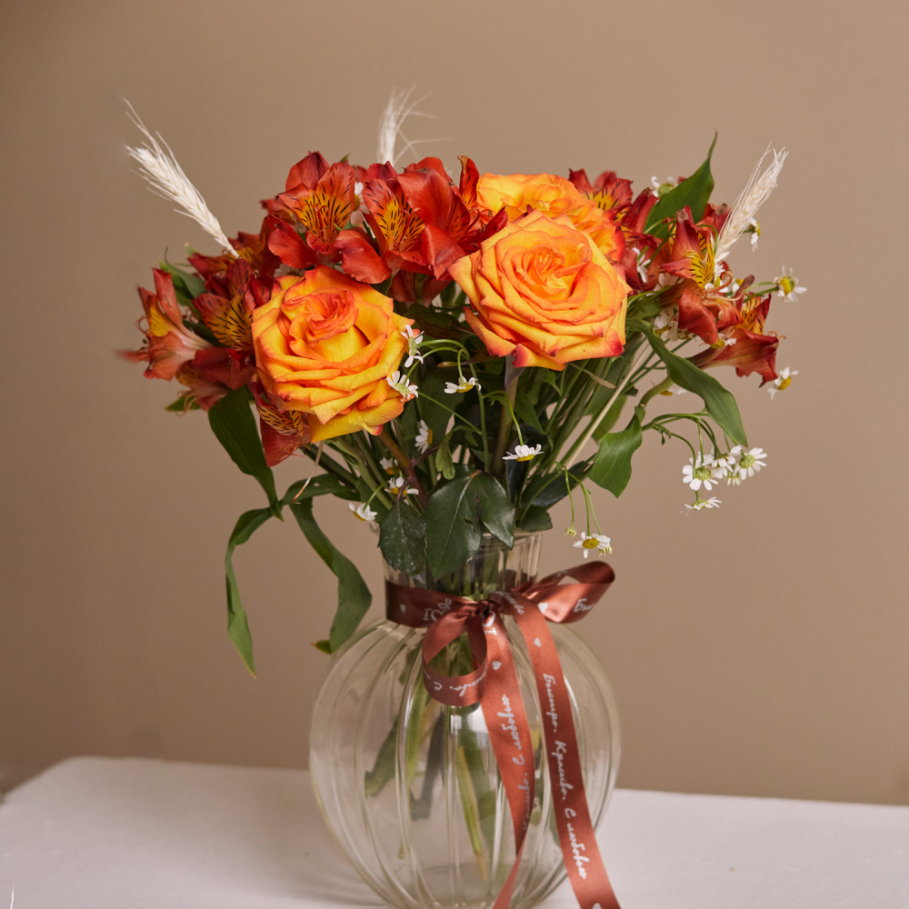Яркий сборный букет из эквадорских роз насыщенного оранжевого оттенка дополнен стойкой альстромерией, мелкими ромашками танацетум и фактурными сухоцветами. Все цветы собраны в стеклянную вазу и перевязаны лентой - композиция полностью готова к вручению и не требует упаковки. Сочетание крупной формы роз и лёгкости альстромерий создаёт выразительный и тёплый образ.
