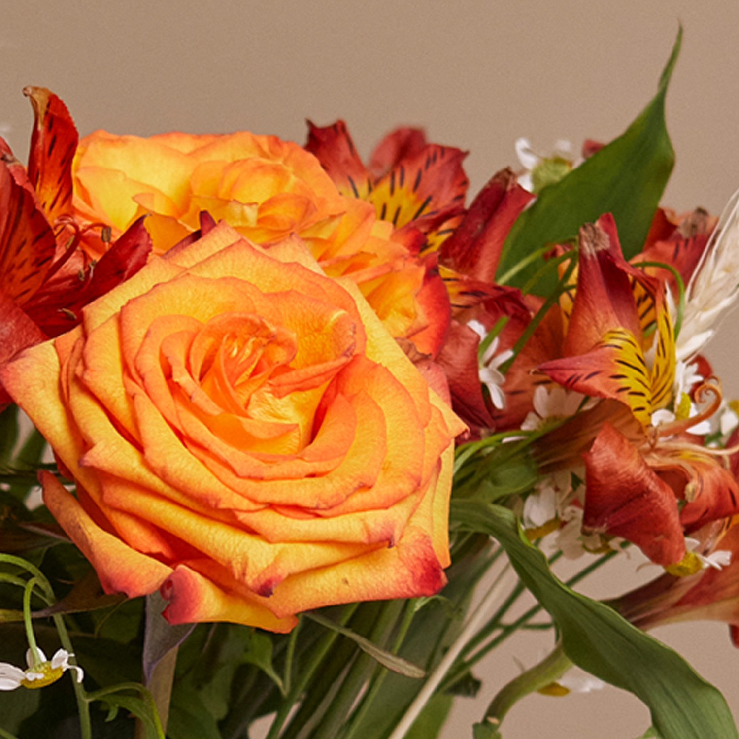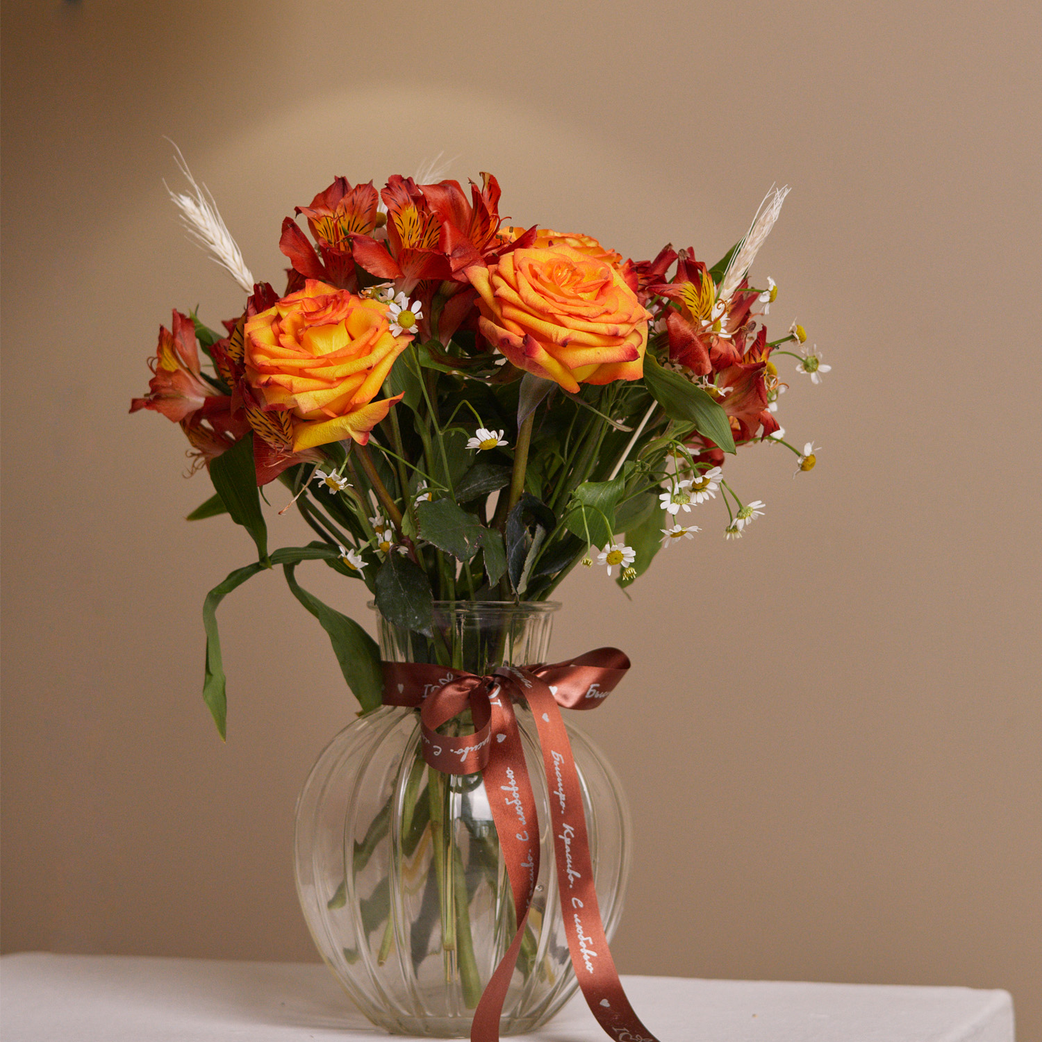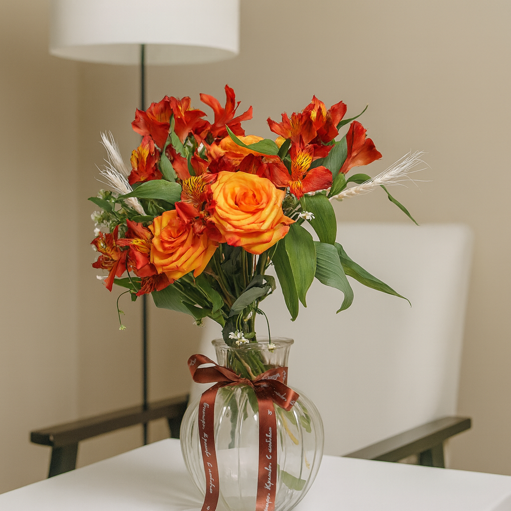 Яркий сборный букет из эквадорских роз насыщенного оранжевого оттенка дополнен стойкой альстромерией, мелкими ромашками танацетум и фактурными сухоцветами. Все цветы собраны в стеклянную вазу и перевязаны лентой - композиция полностью готова к вручению и не требует упаковки. Сочетание крупной формы роз и лёгкости альстромерий создаёт выразительный и тёплый образ.