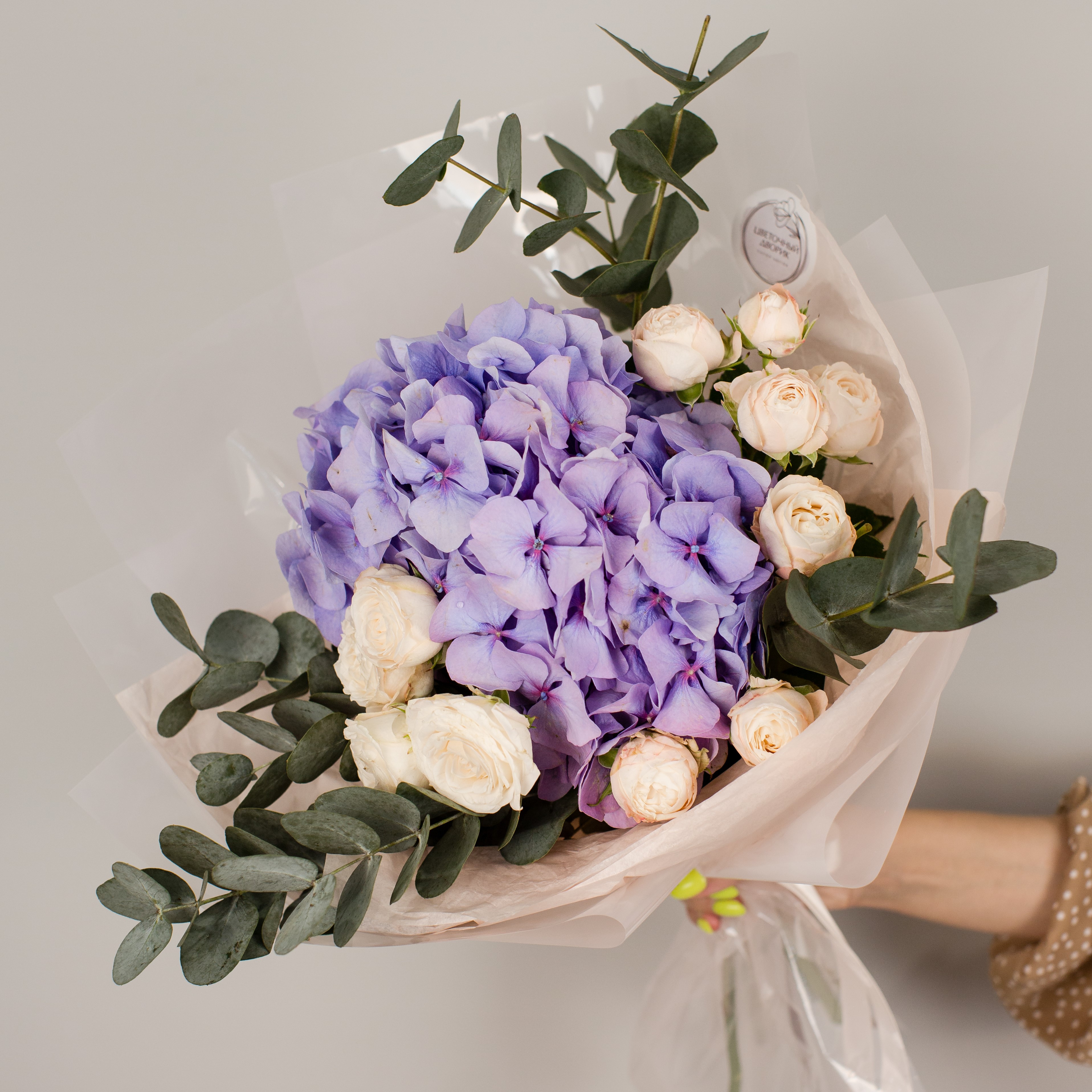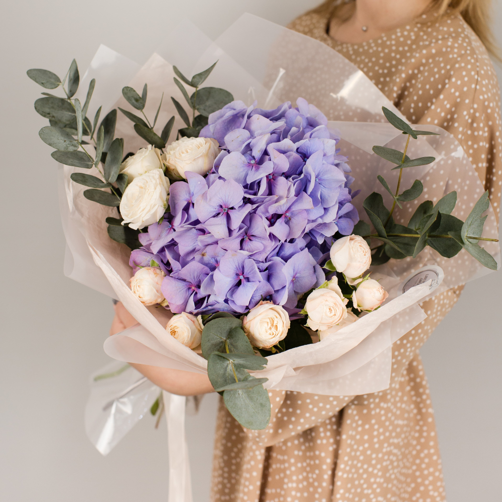 Букет из голубой гортензии и пионовидных роз с эвкалиптом арт. 50471